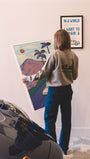 What better feeling than driving through the beautiful hills of California. Windows down, radio up — this illustration is all about chasing golden hour on a California backroad. The pastel mountains, tall palms, and vintage ride bring that dreamy, end-of-day feeling to life.